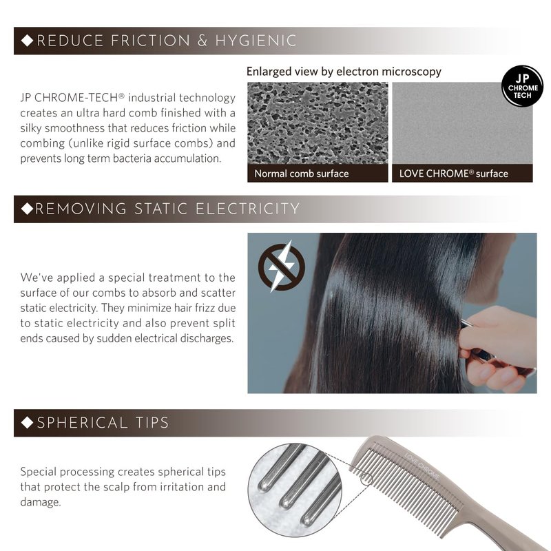 REDUCE FRICTION & HYGIENIC : JP CHROME-TECH industrial technology creates an ultra hard comb finished with a silky smoothness that reduces friction while combing (unlike rigid surface combs).