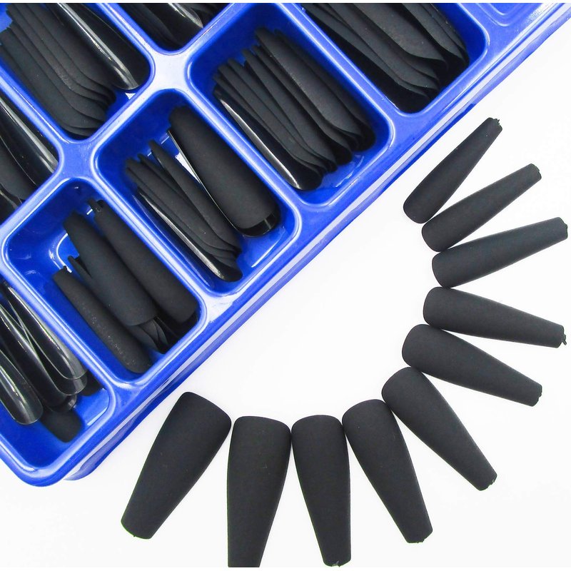 - Matte press on nails long fake nails are long coffin shape full cover fake nails, cuticle area with slight curve design. Colored with trendy and elegent solid matte black color, you can also trim and file artificial coffin nails to medium coffin/square/stiletto/almond nails and short square/stiletto/almond/coffin nails. Easily change your nail style without go to nail salon.