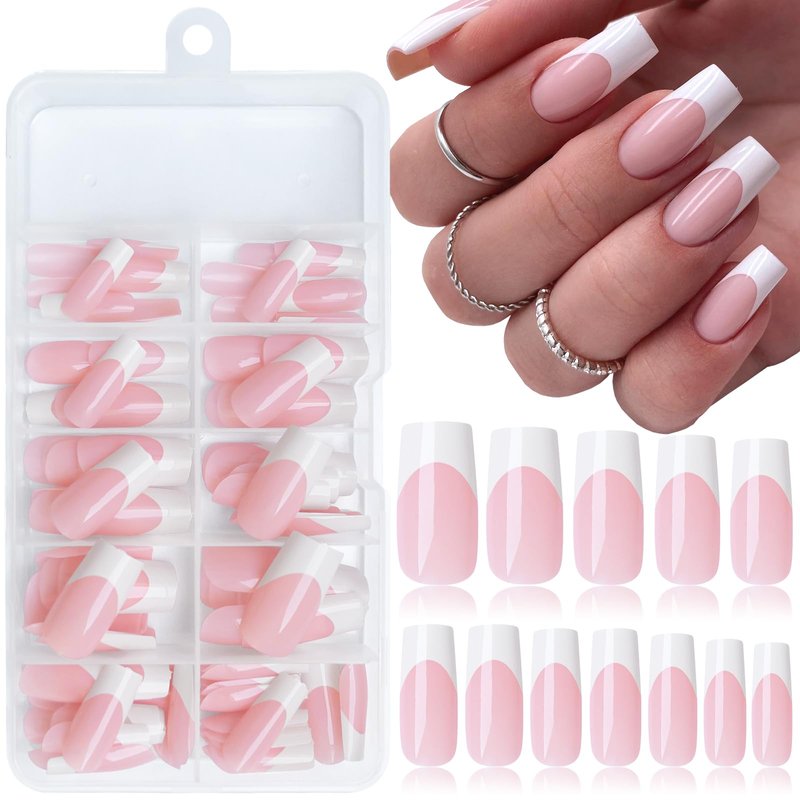 - Classic French Tip Press on Nails: Long press on nails french tips are pre-painted white french nail tip with sheer nude pink base mimics a natural in long length full cover square shape, nude press on nails french tips fake nails are salon-quality french manicure look for women and teen girls at home manicure design.