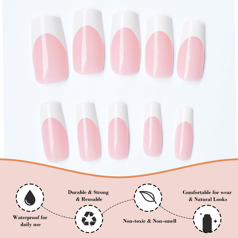 - Easy Applications Press ons Nude Nails: long nails french tips press ons allows you get salon-perfect nails instantly. Just trim and file your nails, clean your natural nails, apply nail glue/adhesive tabs on fake nails, then press on and hold few seconds, a chic and stylish square nail manicure is done!