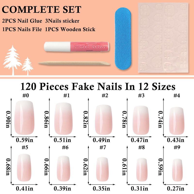 - DIY Ready Press on Nails Kit: Ombres press on nails medium square set includes 1pack 120pc medium square press ons nails, 2 bottle nail glue, 3 sheet nail ahdesive tabs, 1pc nail file, 1pc nail remove stick. A complete press on fake nail kit with everyting need for a quick at home manicure. Nude ombre square nail kit are friendly to both nail techs and nail art beginner manicure DIY.