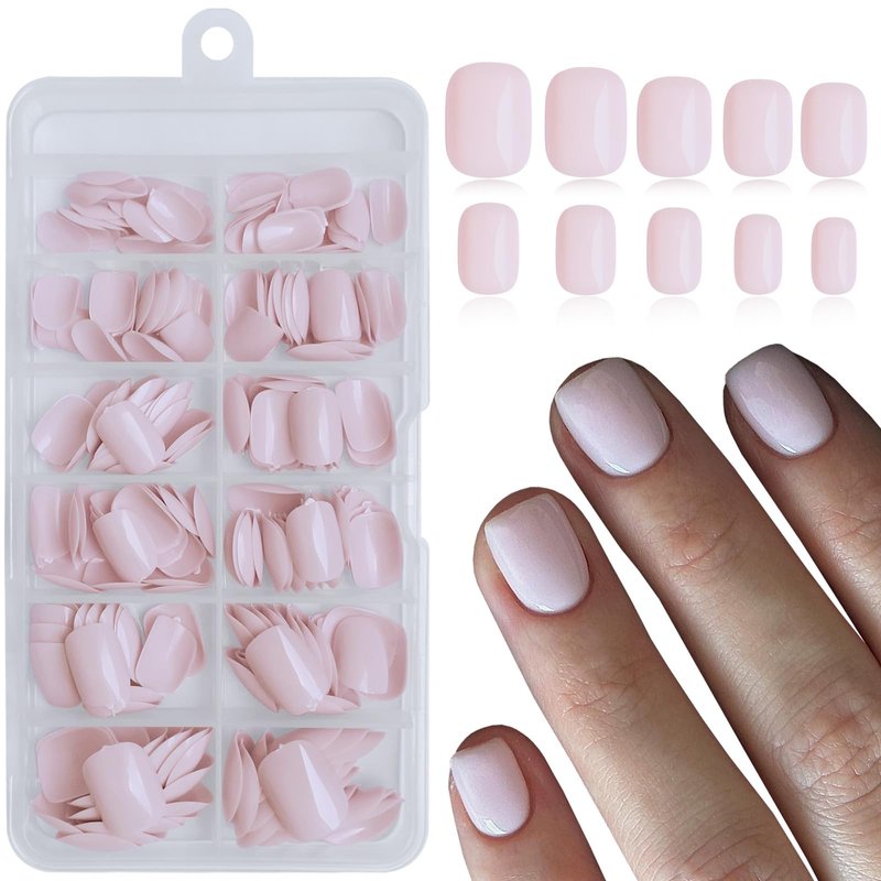 - Fake Nail Kit with Glue: Short Round Square Press on Nails Full Cover include 12 grids 240pcs nude press on nails short round square shape. Short press on fake nails with 1 tube nail glue, 5 sheet nail adhesive tabs,1pc wooden nail stick and 1pc nail file. A simple press on nail kit with nail supplies for nail starter, nail lover and nail tech for travel or at home manicure nail design. Nude nails press ons with glue help you say goodbye to nail salon, easily DIY trendy short nails at home.