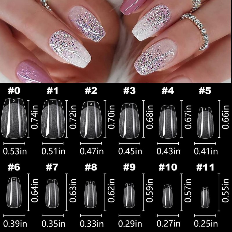 - 💅Short coffin fake nail tips featured with 12 different size, pre numbered inside of the nail tips from 0-11, 50pc coffin nail tips per size, ful cover gel x tips are convenient to choose the best size nail tips to fit your every fingers, gel x coffin nail tips can fit for curve/flat/large/small nail bed finger nails.
