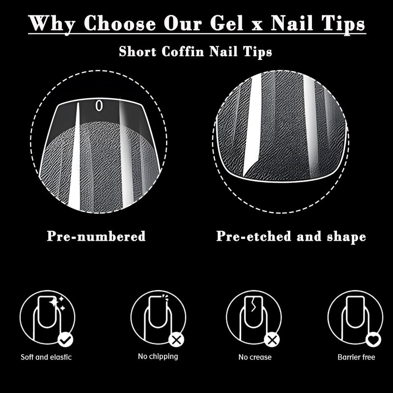 - 💅Gel x nail tips are soft, light and thin with high tenacity, not easy to break and crack. Gel x nails recommend applied with building gel, hard gel or extension gel to strengthen the nails. It will make the gel nail tips more strong, durable and sturdy for a lasting wear.