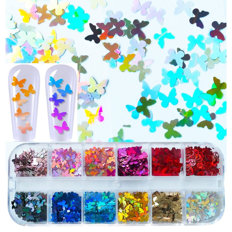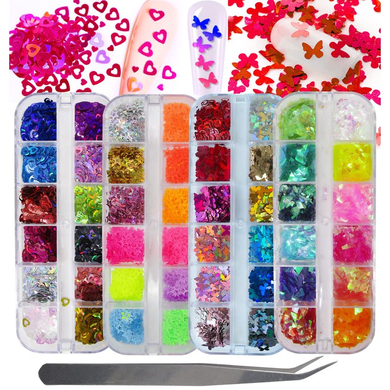 - [ Nail glitter for acryolic nails ] Nail glitter sequins kit includes 12 colors fluorescence glow star glitter sequins+12 color holographic butterfly glitter flakes+12 color holographic heart glitter sparkles+12 colors iridescent irregular mylar flakes+1pc metal applicator. Mixed glitter shapes and colors acrylic nail glitter kit for uv gel nails, acrylic nails and artificial nails decorating.