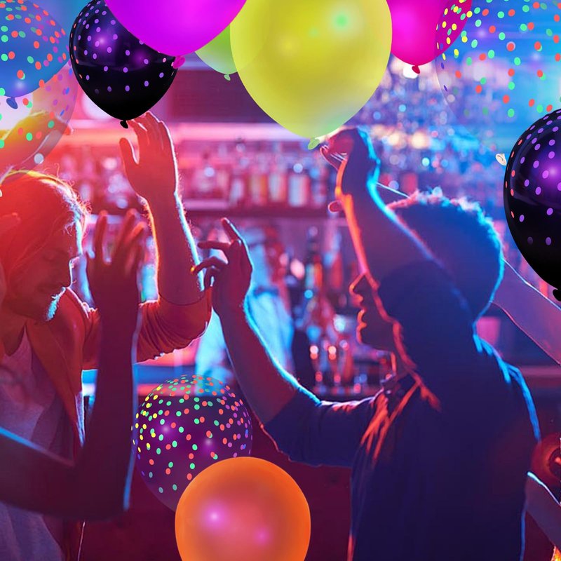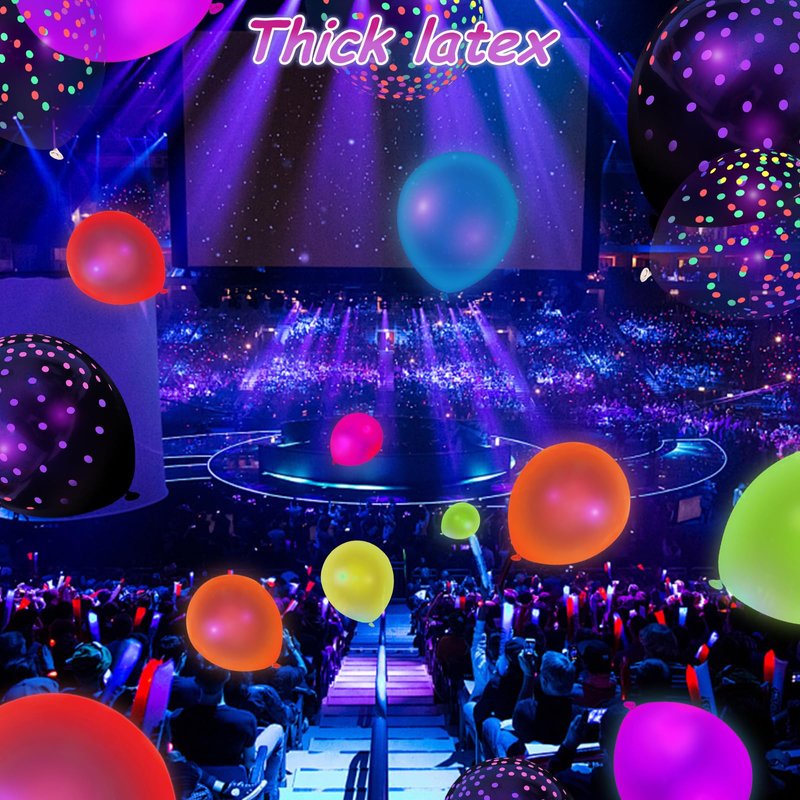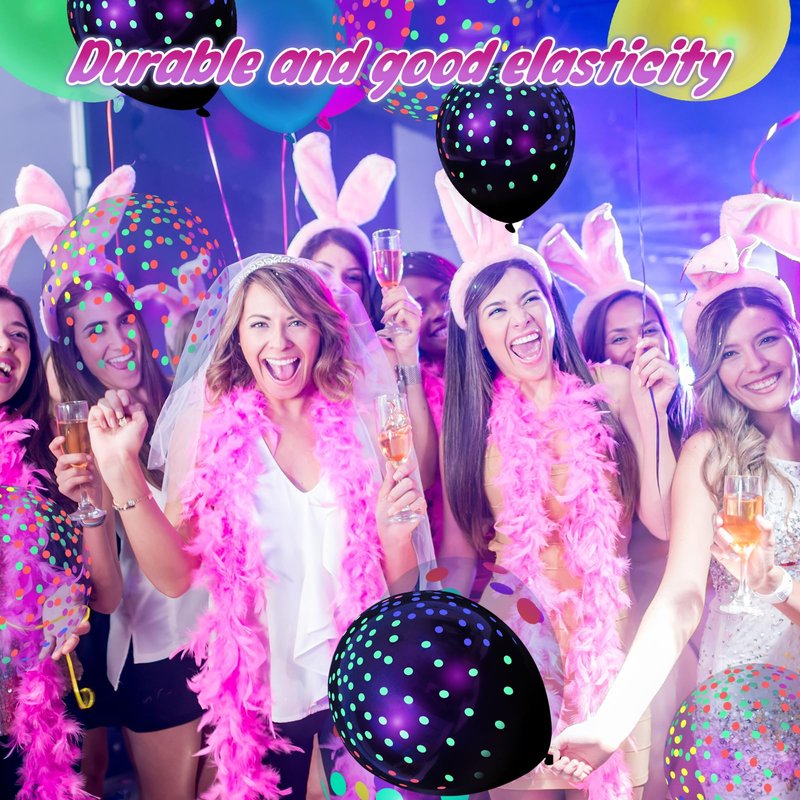 - Package Includes - You will receive 66PCS glow party balloons (12inches), including 22pcs black mini polka dots balloons, 22pcs transparent mini polka dots balloons, and 22pcs solid color fluorescent balloons. The solid color fluorescent balloons come in seven different colors.