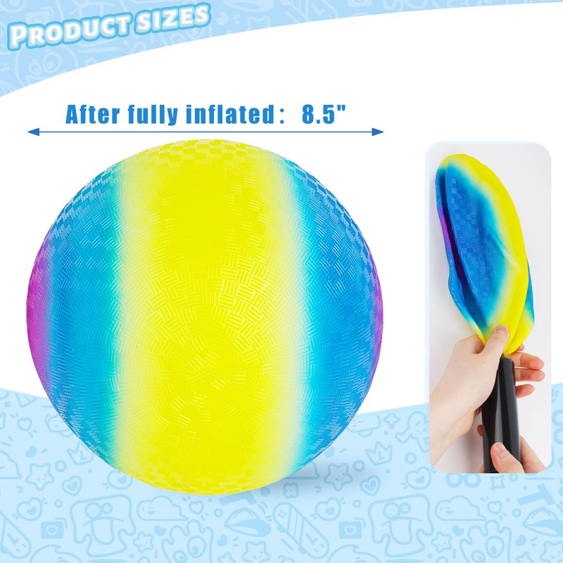 - Package Include: The ball set includes 1PC rainbow playground ball and 1PC air pump (Placed inside of the handle of pump ). The ball has an 8.5inch diameter (after inflating), featuring textured no-slip grip, bright and vibrant.
