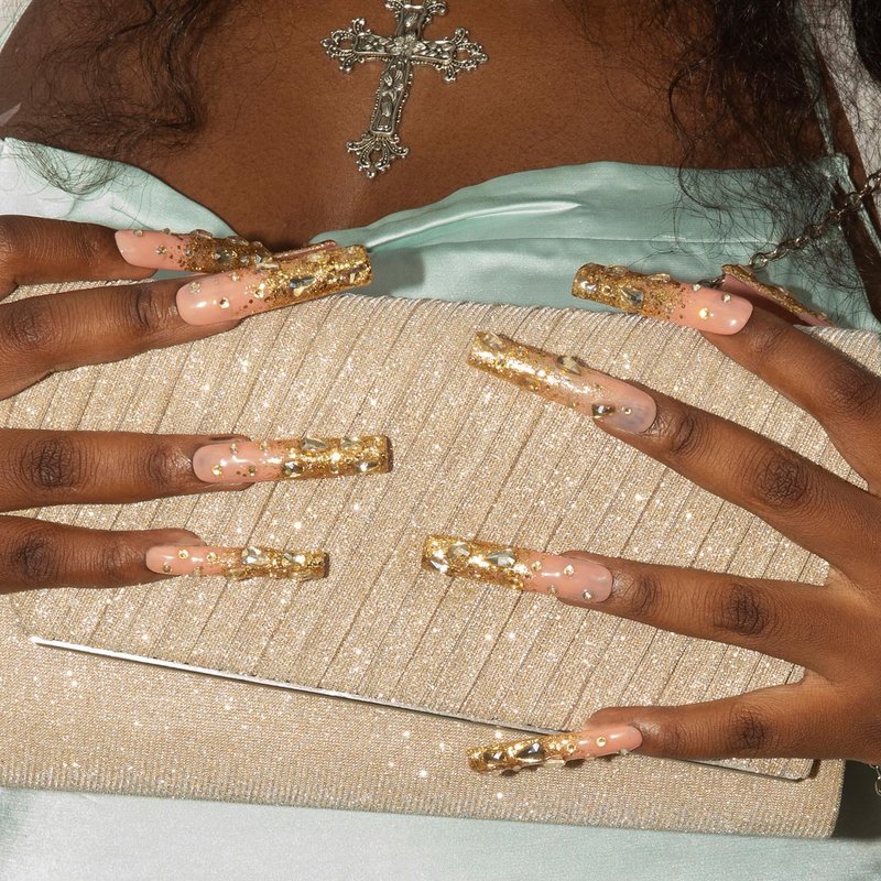 - Gold Bling Brilliance:Elevate your manicure with the dazzling brilliance of gold bling. Each nail is adorned with meticulously placed crystals, creating a luxurious and eye-catching design.