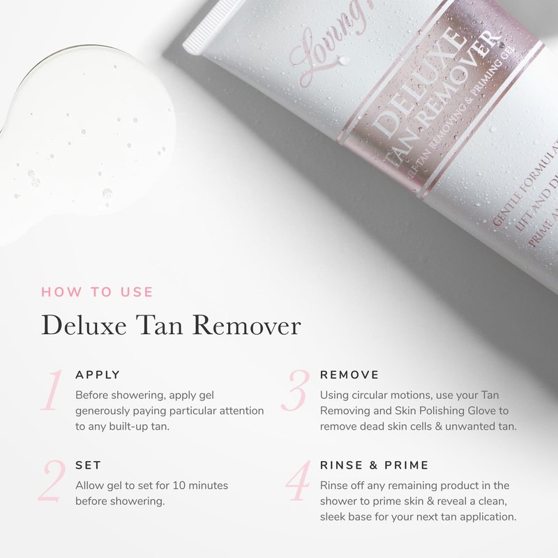 - Made By Tan Lovers for Tan Lovers - The Deluxe Tan Remover Gel is designed to remove self tanner while delicately and effectively priming your skin for your next application. This gentle formula contains premium ingredients to lift away built-up tan leaving your skin feeling smooth.