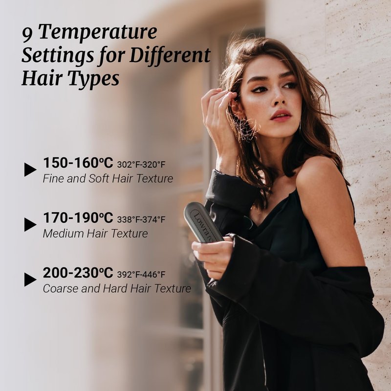 - 9 Temperature Setting - 9 Heat Settings for different hair types provide adjustable heat temperature from 150°C-160°C (300°F-320°F) for fine hair, 170°C-190°C (340°F-370°F) for medium, and 200°C-230°C (390°F-450°F), allowing you to match your specific hair type: thin, fine, thick, curly or wavy. Compared with other straighter hair brush, our product has the latest design, and the comb teeth are more dense, meeting the needs of all kinds of hair quality and thickness.