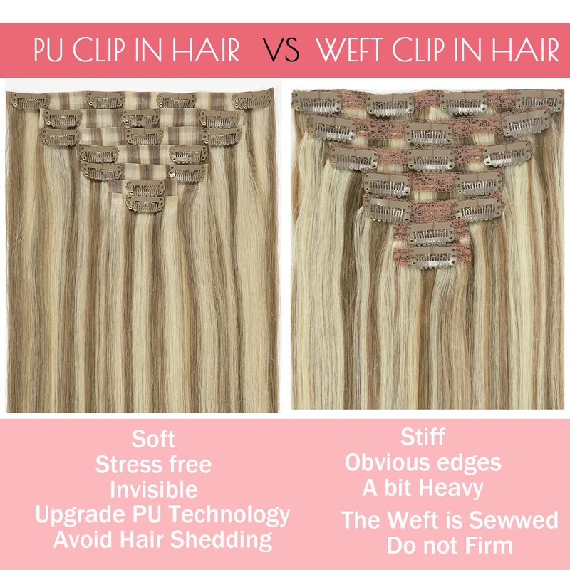 - *【The Advantages of Seamless Hair Extensions Clip in】Unlike old Lace Weft Clip in Hair Extensions, The New Tape Clip in Hair Extensions Updated Soft PU Strips-Thin Weft Edge, No Stiffs, No Shedding, Lightweight and Comfortable.