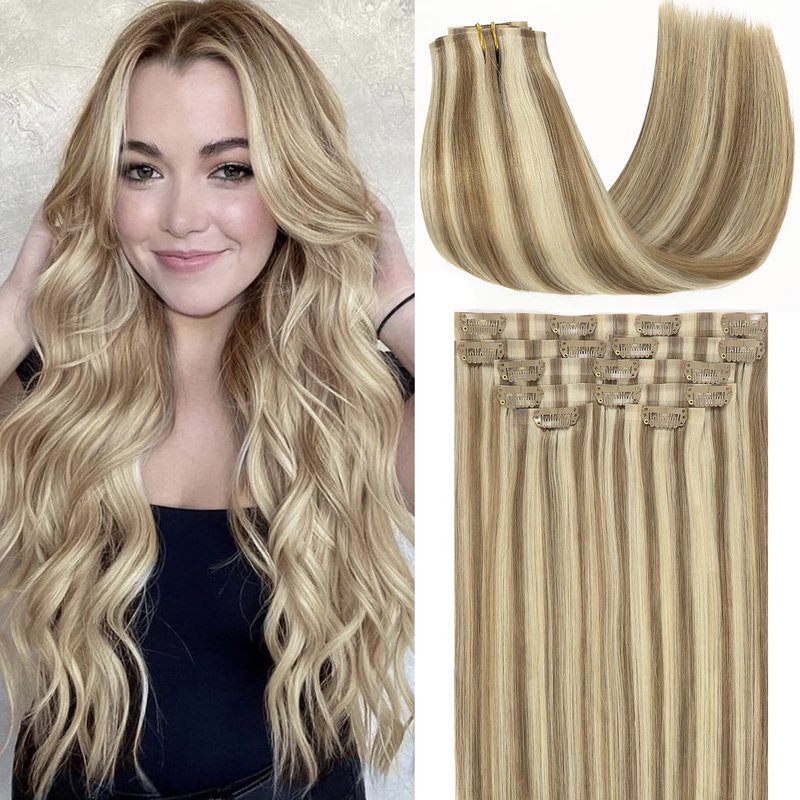 Loxxy Human Hair Extensions Clip in Piano Light Brown Mixed With Platinum Blonde 110Gram 7PCS Seamless Hair Extensions Clip in Human Hair Remy PU Clip In Hair Extensions For Women #P8/60 16Inch