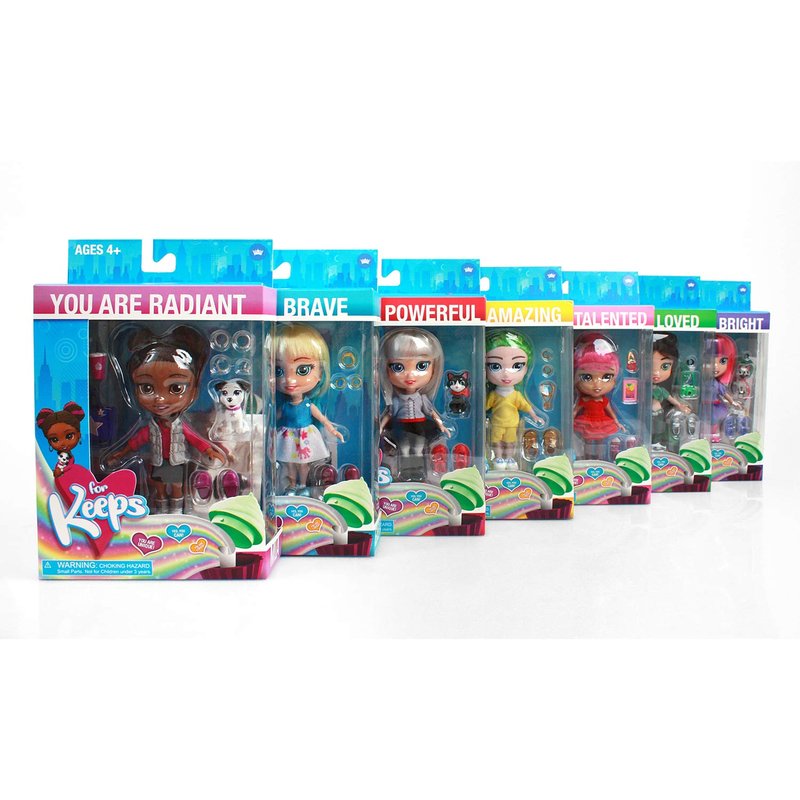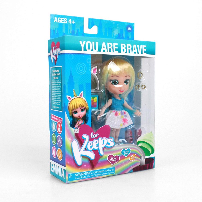 - 5.5” Fashion Doll with 9 pts of articulation packaged in a gift box. Also comes with Choker, bracelet, cellphone, 2 pairs of Mary Janes, unicorn purse, unicorn headband, Interchangeable outfit (tank/poodle dress), Mystery Message Tee, “Unicorn Birthday Cake” Cupcake Keepsake, Pack of 20 affirmation stickers, and a stand with the For Keeps insignia."