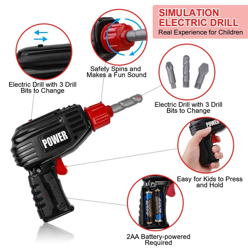 - POWER TOOLS TOY DRILL SET WITH REALISTIC DRILLING SOUNDS AND MOTION: Realistic-looking mini plastic toy electric drill comes with 3 interchangeable drill bits for different function only requires 2AA batteries that simulate sound and movements, which is more attractive and develop kids’ imagination.