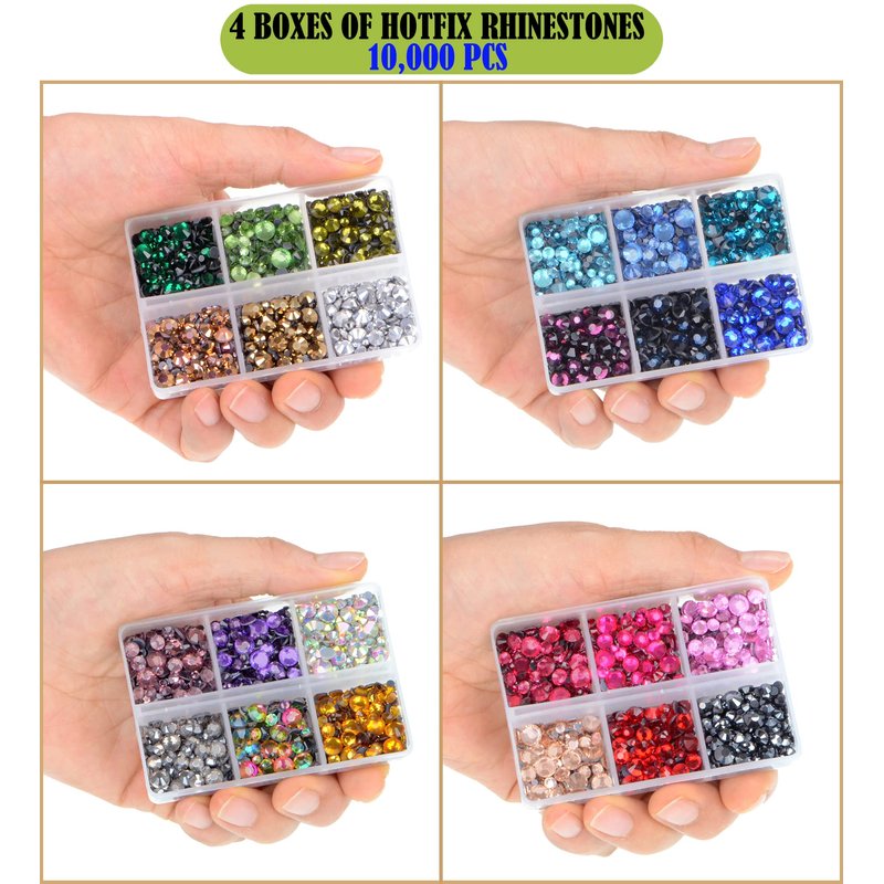 - 4 Boxes of Rhinestone Sets: 10000pcs colored rhinestones in 24 colors, such as rose gold, golden, amethyst, blue, green, hot pink, red, silver ... 1 of tweezers, 2 picking rhinestones pens.