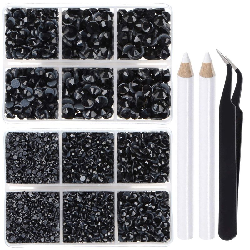 LPBeads 6400 Pieces Hotfix Rhinestones Black Flat Back 5 Mixed Sizes Crystal Round Glass Gems with Tweezers and Picking Rhinestones Pen