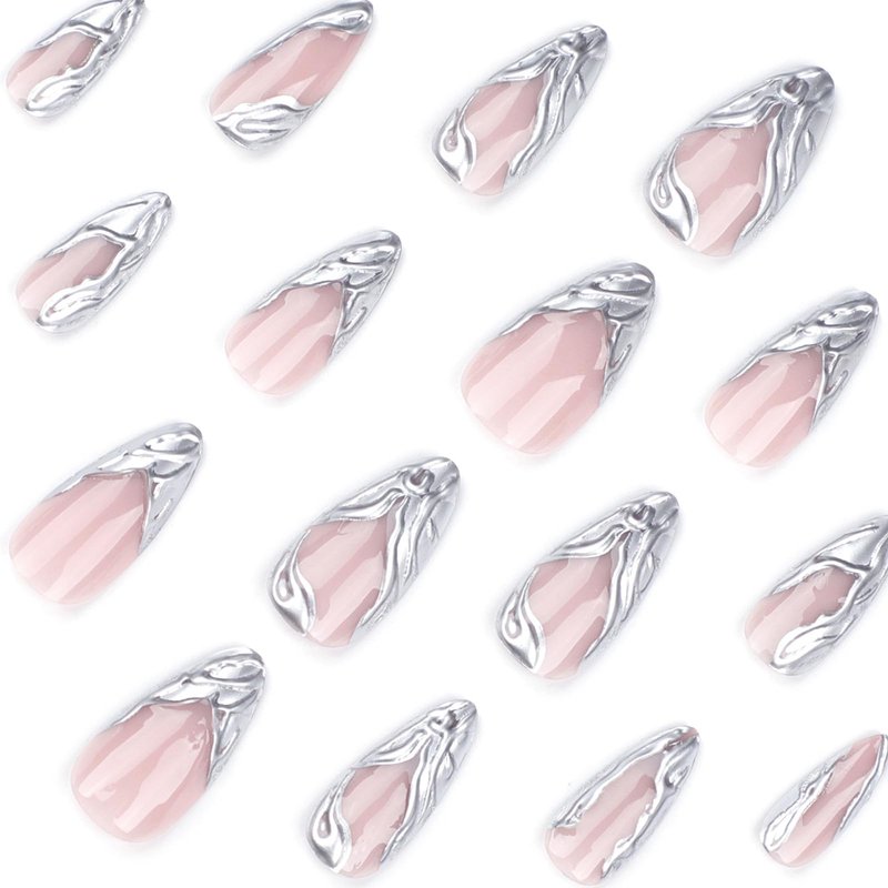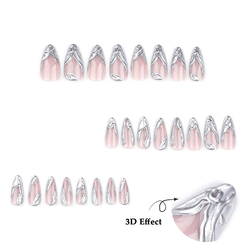 LPOODDNU Almond Press on Nails Medium Length Fake Nails Silver 3D Effect Full Cover Stick on Nails Glossy False Nails Cute Medium Almond French Nails Press ons for Women Girls 24 Pcs