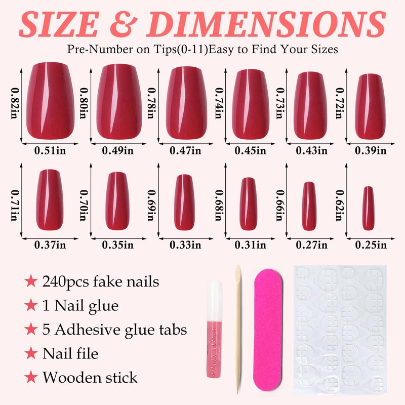 - 💅Varied Sizes & Clear Case:LuckForever press on nail extension set includes 240 pcs short coffin nail tips, 12 different sizes with 20 false nails of each size, coffin glue on nails are individually numbered 0 to 11. Easy to choose the suitable size for every finger. We provide clear case packaging for medium short coffin red nails. Clear case press on nails pack provides a neat and organized way to store and display the coffin nails. You can easily browse through the selection and choose the desired coffin nail tips.