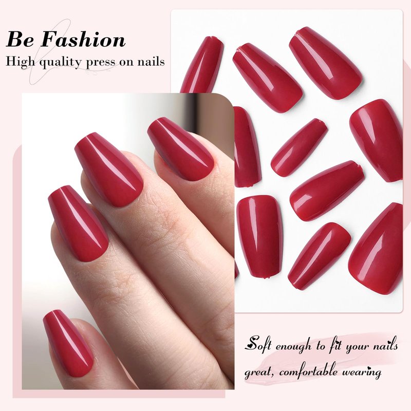 Nails Glue ons Quantity: 240pc short press on nails. Fake Nails Sizes: 12 sizes short glue on nails. False Nails Color: red nail tips. Soft Stick on Nails Material Type: Acrylic press on nails. Artificial Nail Tips Style Name: press on nail coffin. Artificial Fingernails Coverage: Full cover nail tips. Short Nail Tips Form: gel press on nails. Coffin nail tips full cover Target Audience: red press on nails for kids, short press on nails for women, girls press on nails medium, fake nails for teens. Red Nails Usages: red acrylic nails for nail extentions, press on nails making, nail art design. How to Use Press ons: uñas acrílicas press ons coffin nails with nail glue, apply nails with nail adhesive tabs and then apply gel nail polish, nail decorations with nail charms for nail art design. Ballerina Full Nail Tips Medium Length: coffin fingernails without any trace, not affect daily life. Easy Application Coffin Glue on Nails Short: Glue on press on coffin nails are suitable for beginners. Acrylic Coffin Nail Tips Multiple Use: Coffin nail medium length are perfect for mother's day and christmas. Red Fake Nails Coffin Professional Results: Medium coffin nail tips easily get salon perfect press on nails. Red press on nails short coffin show your natural press on nails, with different base colors for different fake nail tips look. Comfortable Fit Short Fake Nails: Our red coffin fake nail tips fit your fingernails comfortable and natural. Full Coverage Nail Tips with Endless Possible: With colored medium length press on nails coffin mix and match with nail charms for different nail art design. Fake Nails Red Coffin Seamless Blending: Whether you prefer natural nail tips or gel extensions, press on fake nails seamlessly blend with your natural nail bed. Strong Full Cover Nail Tips Coffin: Press on nail medium coffin fingernails are incredibly strong and resilient, coffin nail tips for acrylic nails offering long-lasting wear without sacrificing style. Perfect Foundation with Coffin Tips: Clear acrylic nails press ons short coffin can provide the perfect foundation for your nail art decoration. Enhance Natural Nails with Gel Fake Nails Square: With nail extension tips, say goodbye to weak, brittle nails. Short coffin press-on nails are artificial nails designed for easy application and a stylish appearance. These nails feature a coffin shape, also known as ballerina nails, with a shorter length compared to traditional coffin nails.The coffin shape is characterized by its squared-off tip with straight sidewalls, resembling the silhouette of a coffin or a ballet slipper. Short coffin press-on nails offer a chic and sophisticated look while maintaining practicality for everyday wear.Press-on nails are convenient alternatives to traditional manicures, as they require no professional salon services for application. They typically come with adhesive tabs or glue, allowing for quick and hassle-free attachment to natural nails.Short coffin press-on nails can be customized with various nail designs, colors, and finishes to suit individual preferences and styles. Whether you prefer a minimalist look with a solid color or a more intricate design with nail art, these nails provide a versatile canvas for expressing your creativity.Overall, short coffin press-on nails are perfect for individuals who desire a trendy and elegant nail style without the commitment or maintenance of longer nails. They offer a polished appearance with minimal effort, making them ideal for both everyday wear and special occasions.The coffin shape, also known as ballerina nails, is characterized by its squared-off tip with straight sidewalls, reminiscent of the silhouette of a coffin or a ballet slipper. However, short coffin nails are trimmed to a more manageable length compared to their longer counterparts.These nails offer a chic and sophisticated appearance while maintaining practicality for everyday activities. The shorter length makes them easier to manage and less prone to breakage than longer nails. Short coffin nails can be customized with various nail designs, colors, and finishes to suit individual preferences and styles.