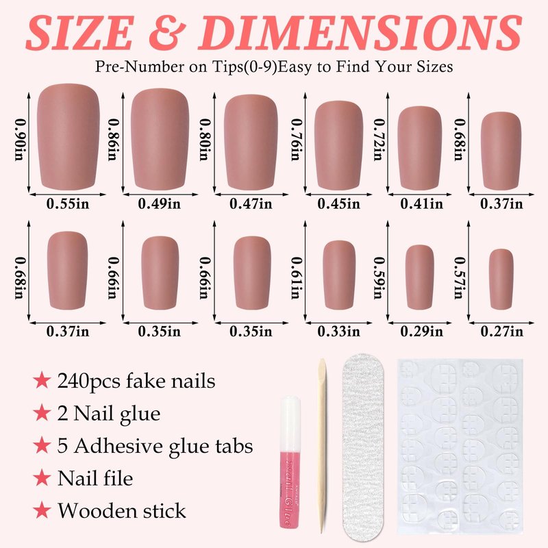 - Medium length Press On Nails Kit: Matte square fake nail kit includes 240pcs matte brown glue on nails medium square, 5pcs nail adhesive tabs, 2 tube nail glue and 1pc 100/180 grit nail files. LuckForever medium length square press on nails nails are 12 sizes, 20 tips for each size, a total of 240 piece square nails press ons. Matte press on nails square are pre-numbered 0-9 on the tips for easily find the suitable size.