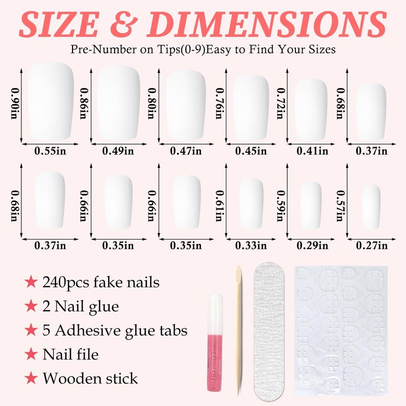 - Medium length Press On Nails Kit: Matte square fake nail kit includes 240pcs matte white glue on nails medium square, 5pcs nail adhesive tabs, 2 tube nail glue and 1pc 100/180 grit nail files. LuckForever medium length square press on nails nails are 12 sizes, 20 tips for each size, a total of 240 piece square nails press ons. Matte press on nails square are pre-numbered 0-9 on the tips for easily find the suitable size.