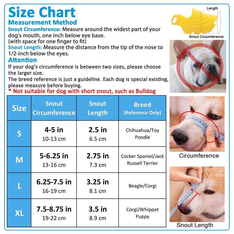 - MUZZLE FOR SMALL DOG-Size M for snout circumference is 5-6.25 in and snout length is 2.75 in. Please measure the your dog's snout circumference and length before buying.