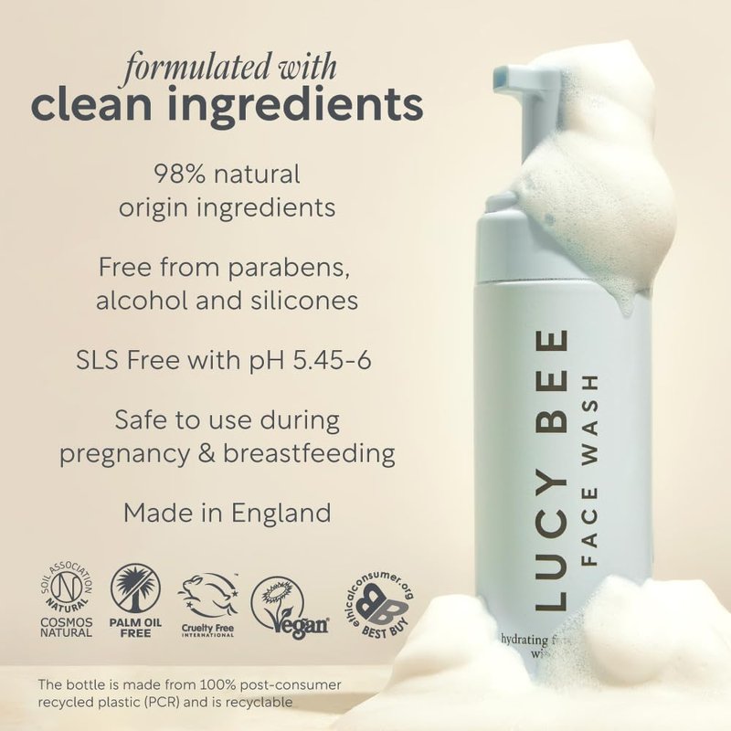 Lucy Bee Hydrating Foaming Face Wash, Dermatologist Approved for Sensitive Skin, 200+ Pumps, Certified Natural, Vegan & Palm Oil Free, Gentle Facial Cleanser, 5.07 fl oz.