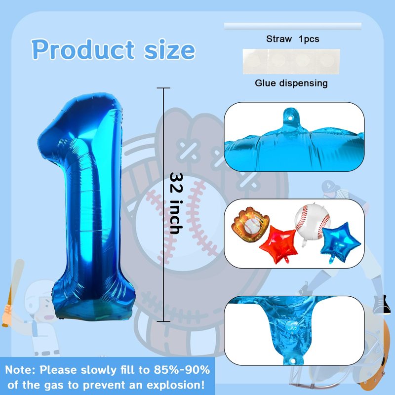 - 【1st Baseball Bat Mylar Balloon】Package includes:1 Pcs blue number 1 balloon,1 Pcs baseball glove foil balloon,1 Pcs round baseball foil balloon,1 Pcs star red balloons,12 Pcs glue dots,1 Pcs straw and 1 Pcs ribbon.Elevate your party with our eye-catching Number 1 baseball balloon set! It adds a passionate and dynamic sports atmosphere to any occasion.