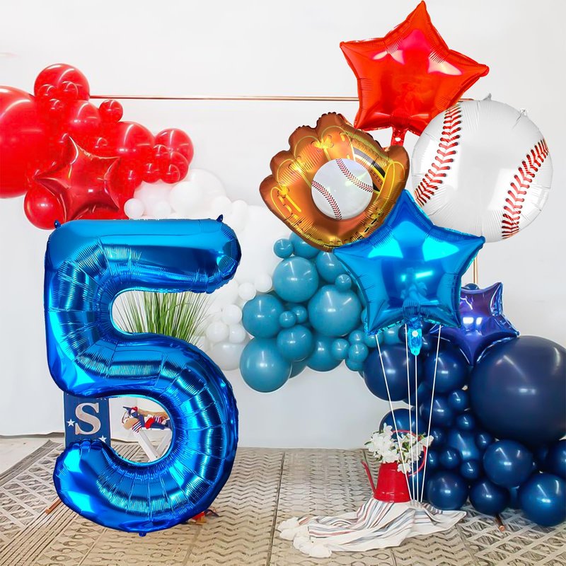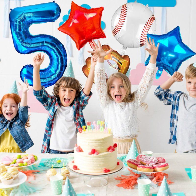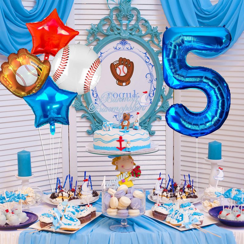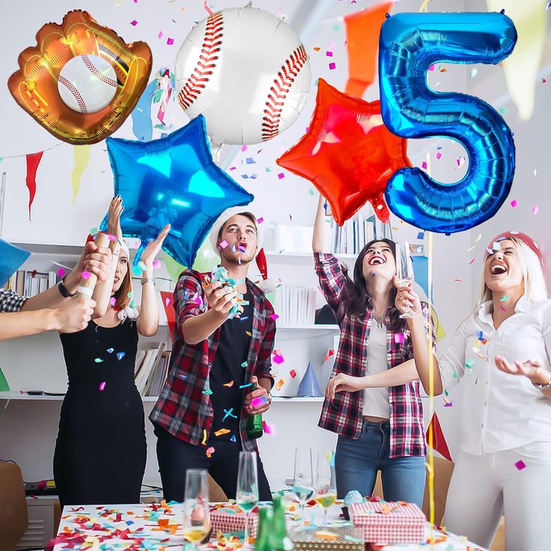 - 【5th Baseball Bat Mylar Balloon】Package includes:1 Pcs blue number 5 balloon,1 Pcs baseball glove foil balloon,1 Pcs round baseball foil balloon,1 Pcs star red balloons,12 Pcs glue dots,1 Pcs straw and 1 Pcs ribbon.Elevate your party with our eye-catching Number 5 baseball balloon set! It adds a passionate and dynamic sports atmosphere to any occasion.