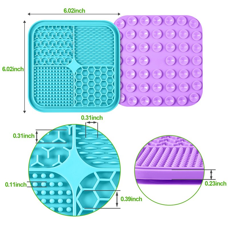 - ❤️🐶🐱【Slow Feeder Mat for Dogs & Cats】: Four different textured surfaces design is prefect for spreadable treats, such as cream cheese, yoghurt, peanut butter and so on. It is a peanut butter mat for dogs to extend the feeding time and aid digestion. This feeding mat is an ideal size for cats, puppies, small meduim and large dogs.
