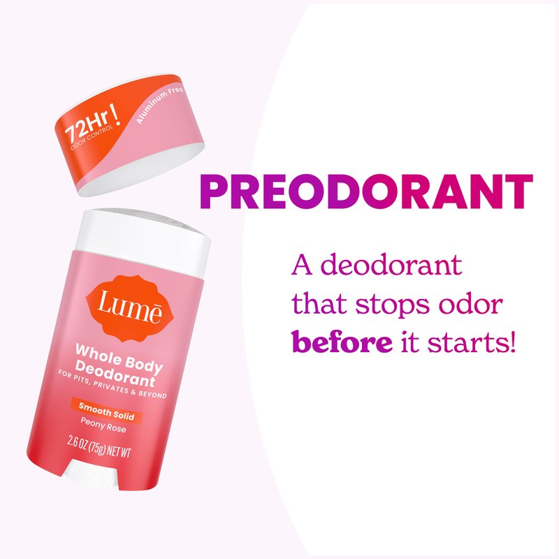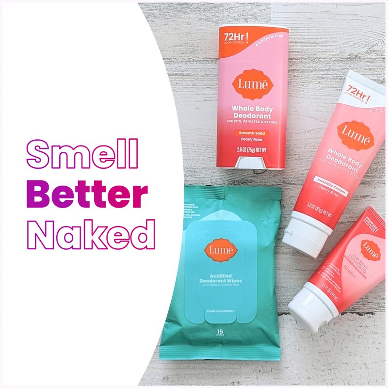 EVERYTHING YOU NEED TO SMELL BETTER EVERYWHERE - Odor control for pits, privates and beyond—think feet, underboob, belly buttons, tummy folds, butt cracks, thigh creases or anywhere else you have odor but wish you didn’t. OUTRAGEOUSLY EFFECTIVE - Lume Whole Body Deodorant, Acidified Body Wash, and Acidified Deodorant Wipes are all clinically proven to control odor. The Starter Pack includes everything you need to smell as good as humanly possible. POWERED BY SCIENCE - Our formulas are pH optimized to control odor anywhere you have it but wish you didn’t. SERIOUSLY SAFE - Doctor developed and safe for any external use. Our deodorant, body wash, and wipes are all aluminum free, baking soda free, and paraben free. Hypoallergenic and skin safe for even your most sensitive parts. PEONY ROSE STARTER PACK - Peony Rose 2.6 ounce Smooth Solid, 3.0 ounce Invisible Cream Tube Deodorant, and 1.5 ounce Acidified Body Wash Mini, plus 15 count Acidified Deodorant Wipes in Cool Cucumber.