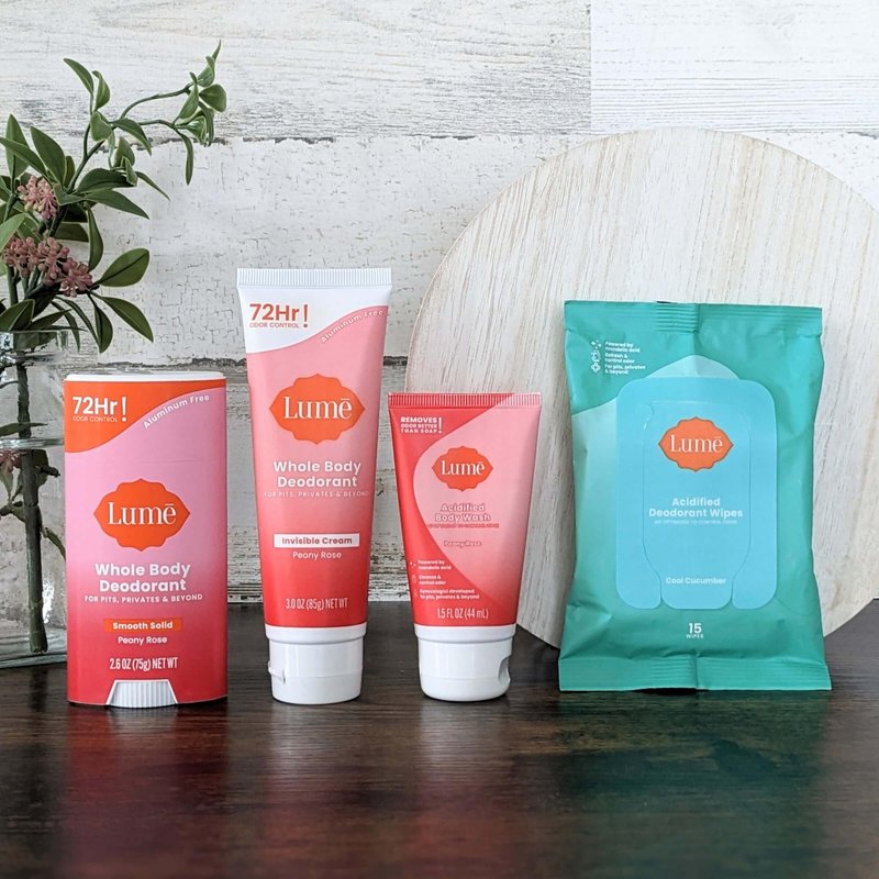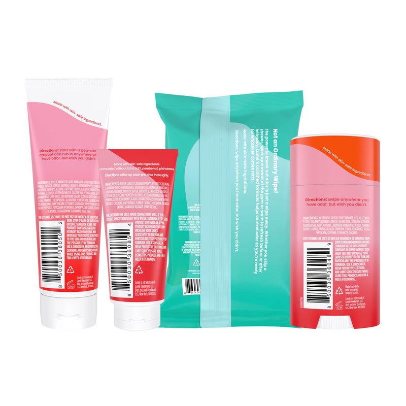 - OUTRAGEOUSLY EFFECTIVE - Lume Whole Body Deodorant, Acidified Body Wash, and Acidified Deodorant Wipes are all clinically proven to control odor. The Starter Pack includes everything you need to smell as good as humanly possible.