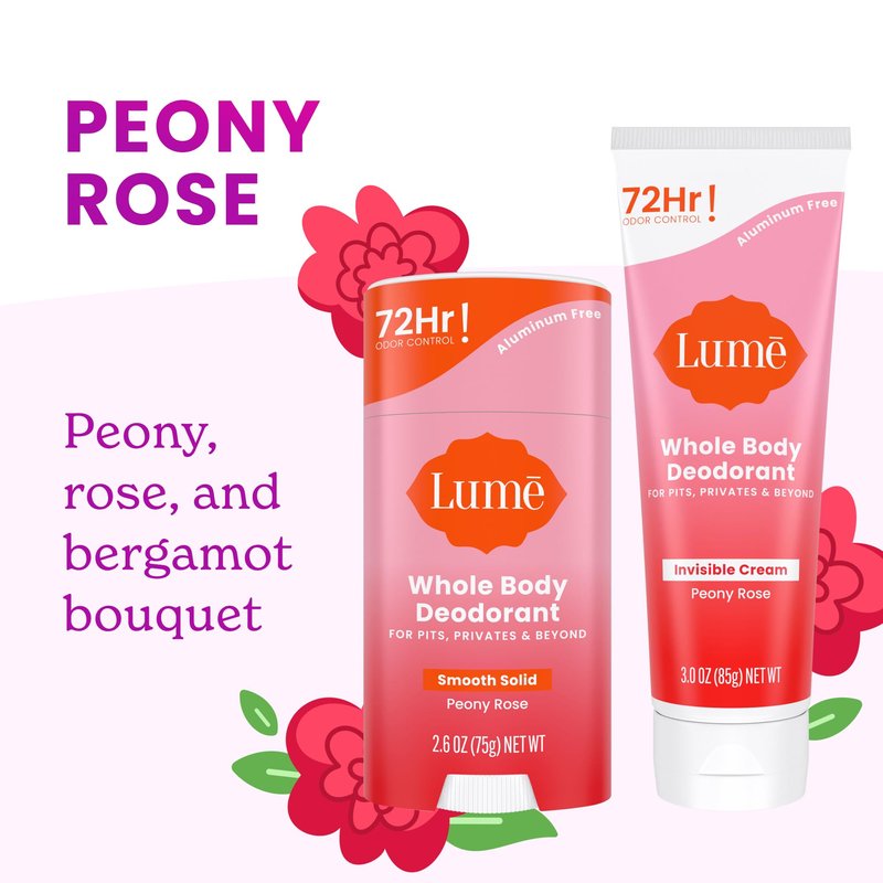 Lume Whole Body Deodorant - Invisible Cream and Solid - 72 Hour Odor Control - Aluminum Free, Baking Soda Free, Skin Safe - 3.0 Ounce Cream and 2.6 Ounce Solid Bundle (Peony Rose)