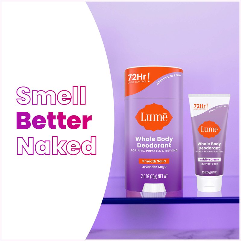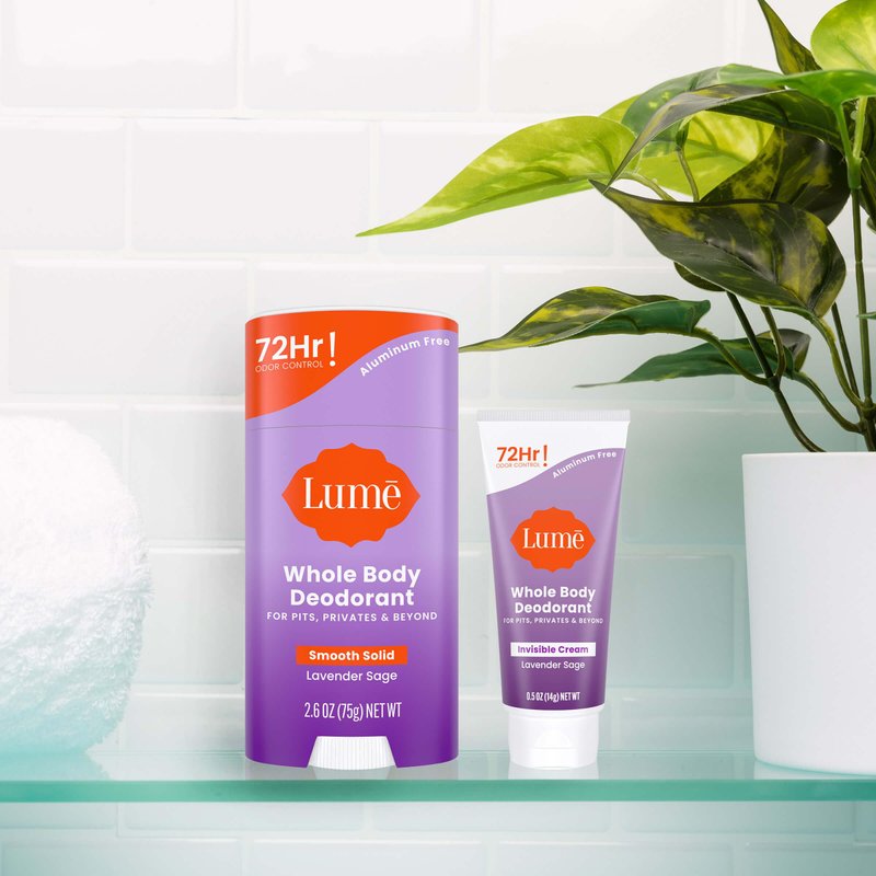 Lume Whole Body Deodorant - Invisible Cream Tube Mini and Solid Stick - 72 Hour Odor Control - Aluminum Free, Baking Soda Free, Skin Safe - 0.5 Oz Mini Tube + 2.6 Oz Solid Stick (Lavender Sage)