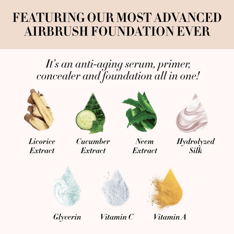 - Our Most Advanced Airbrush Foundation Ever: Each system comes with 2 bottles of our Silk Advanced Foundation. This unique formula combines the benefits of an anti-aging serum, primer, concealer, and foundation all in one, and is enriched with skin-loving ingredients such as Licorice Extract, Cucumber Extract, Neem Extracts, Glycerin, Hydrolyzed Silk, Vitamin C, and Vitamin A.