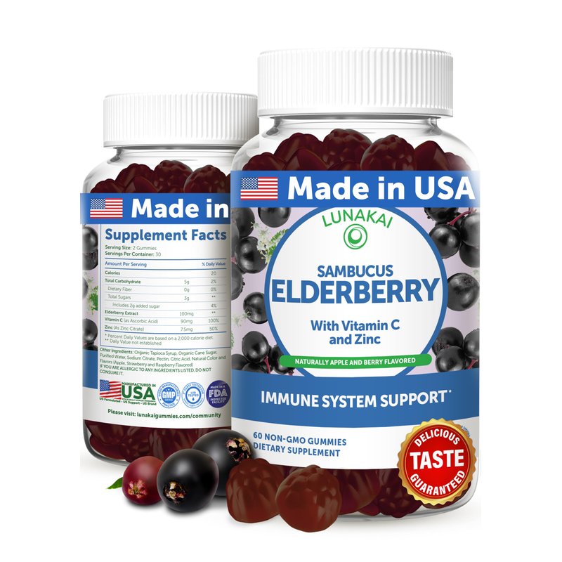 Lunakai USA Made Sambucus Elderberry Gummies - Delicious Immune Support with Vitamin C & Zinc - Non-GMO, Gluten-Free, 60ct for Kids & Adults