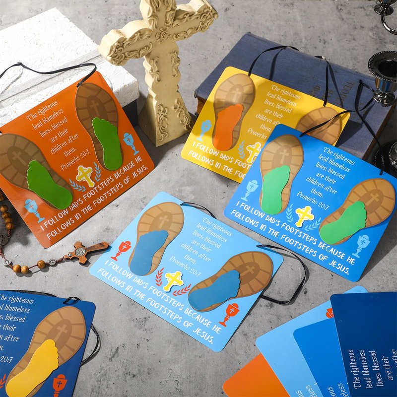 Features: Celebrate Father's Day with our religious Father's Day footprint craft kit. It's not just about giving a gift, but creating memories that last a lifetime. Helping your child leave their adorable footprint in craft form. The ideal gift to say [I love you, Dad]. With religious themes and an opportunity to make a Father's Day footprint craft kit, this kit provides an engaging activity for kids and a heartfelt keepsake for dads. Bring out the artist in your child and make Dad's day unforgettable. Specifications: Main material: cardstock Color: vibrant colors Size: Craft: about 7.75 x 6.25 inches/ 19.68 x 15.88 cm Ribbon: about 21.65 inches/ 55 cm Package includes: 24 Sets of Father's Day footprint craft kits 24 x Black ribbons 1 x Instruction book Notes: Winding risk may exist, please keep it away from kids under 3 years old. Manual measurement, please allow slight errors on size. The color may exist a slight difference due to different screen displays.