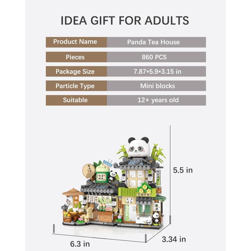 - Panda tea house street scene building, 860pcs mini blocks, made of safe ABS material, durable, lightweight, safe. The surface and edge of each block are smooth and burr free. All parts fit well and are not easy to loosen