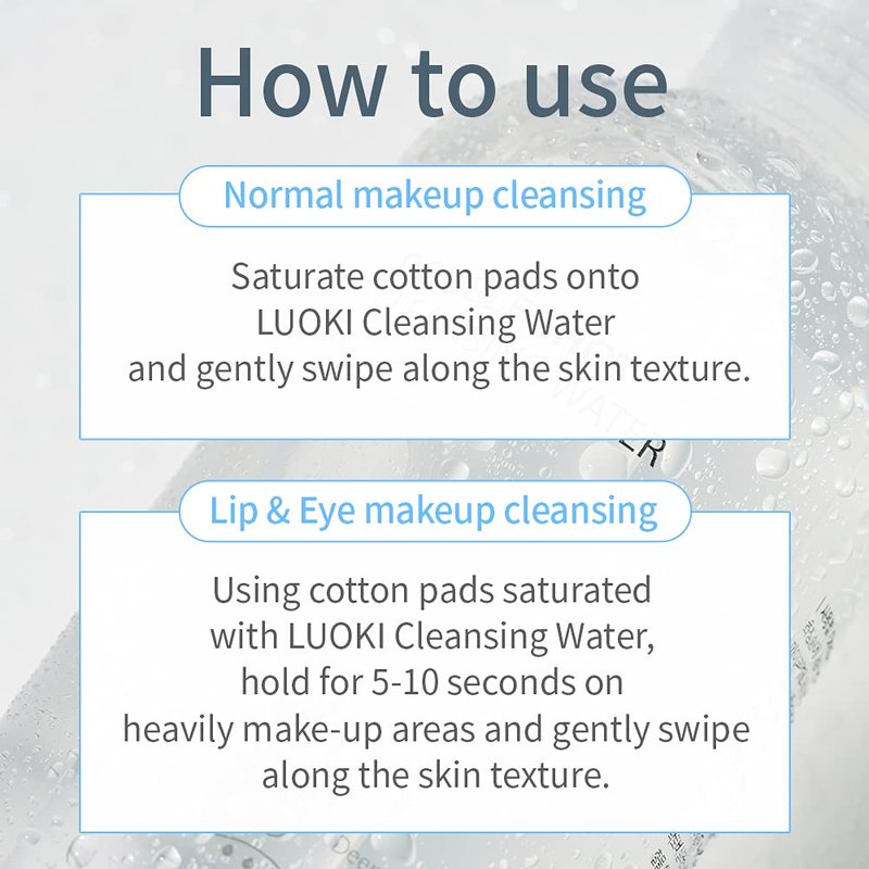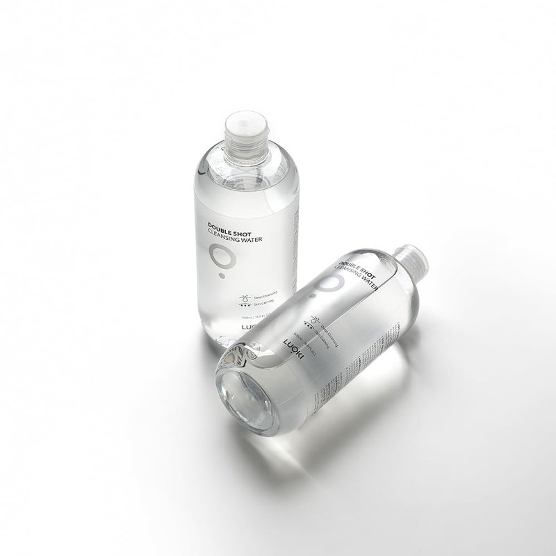 LUOKI DOUBLE SHOT CLEANSING WATER clearly removes makeup without leaving residue, which is an ideal combination of surface-active and nature-originated deep cleansing ingredients to serve as the basic structure of a cleansing water.