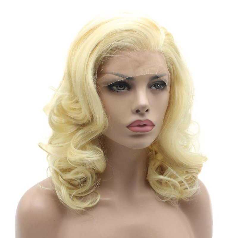 Lushy Medium length Wavy Light Blonde Wig Full Density Half Hand Tied Heat Friendly Synthetic Lace Front Wig