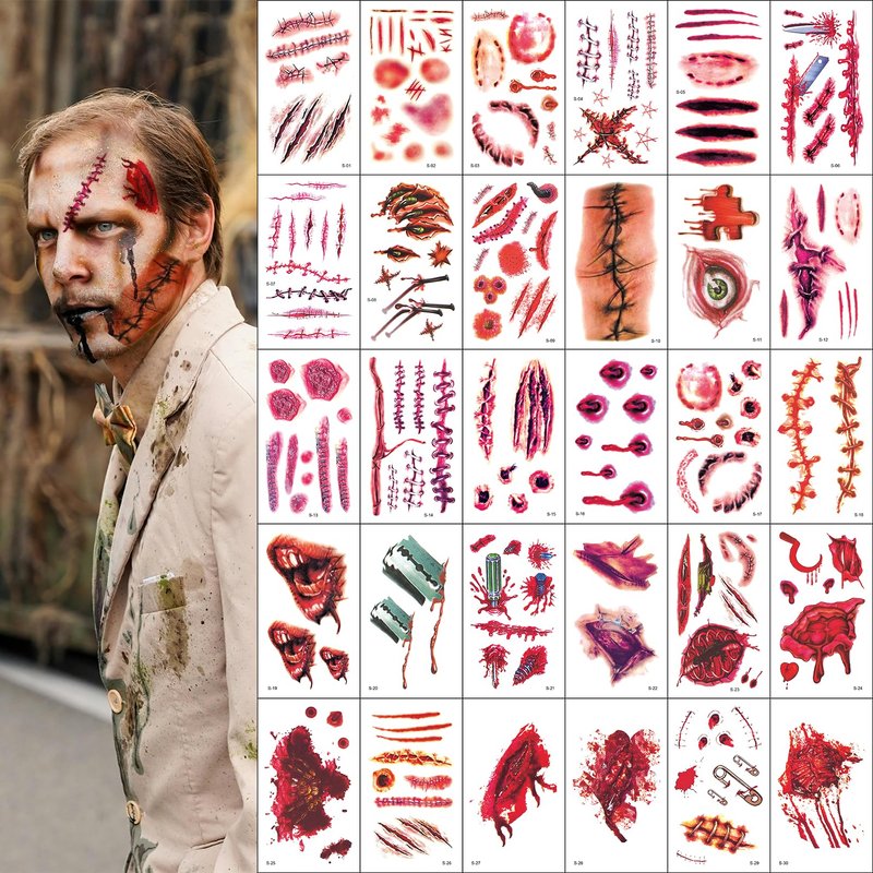 - 🖤 【Non-Toxic & Kid-Friendly】 Lusstiazz fake blood temporary tattoo stickers use non-toxic red ink, ensuring they are safe for children's skin . Whether for kids, teens, or adults, these zombie tattoos are a perfect choice!