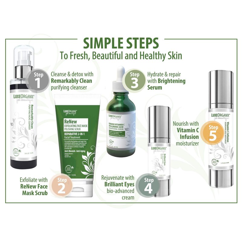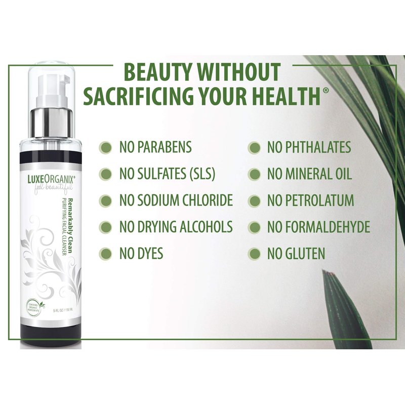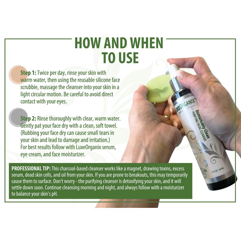 HELLO BEAUTIFUL, FINALLY YOUR SEARCH FOR FRESH CLEAR SKIN IS OVER. INTRODUCING REMARKABLY CLEAN PURIFYING FACIAL CLEANSER BY LUXEORGANIX: BREATHES LIFE INTO YOUR SKIN: This detoxifying activated bamboo charcoal face cleanser draws out toxins and impurities, tightens and lifts dull, dead skin, and draws out pore-clogging impurities, oils, and makeup like a magnet. Perfect for all ages. NATURAL SKIN CARE, YOUTHFUL LOOKING SKIN, MADE IN THE USA: Anti aging and pore minimizing, collagen boosting MSM drives botanical extracts deep into skin to balance oil production and improve tone, texture, and elasticity, leaving skin revitalized. SULFATE-FREE, GENTLY LATHERS, RINSES CLEAN FOR SMOOTH, CLEAR SKIN: Paired with our deep cleansing facial massager (included), this aloe-based organic face wash unclogs pores and easily washes away makeup for remarkably clean, fresh and brighter skin. SAFE FOR ALL SKIN TYPES, AND GREAT FOR SENSITIVE SKIN: Soothe your skin from irritation and redness with a gentle combination of enriched natural non-clogging oils that work as an antioxidant remedy to clean, protect and soften skin. You'll love it. Why Choose LuxeOrganix? MADE IN THE U.S.A. LuxeOrganix is a Woman-Owned company that was started because we believe that the future of beauty is in high-quality, natural products that perform as well as conventional alternatives, but without controversial, harsh ingredients. In a world that has left customers wanting and needing better, healthier products, we are committed to raising the bar and setting new standards. LuxeOrganix. Feel Beautiful...Without Sacrificing Your Health!