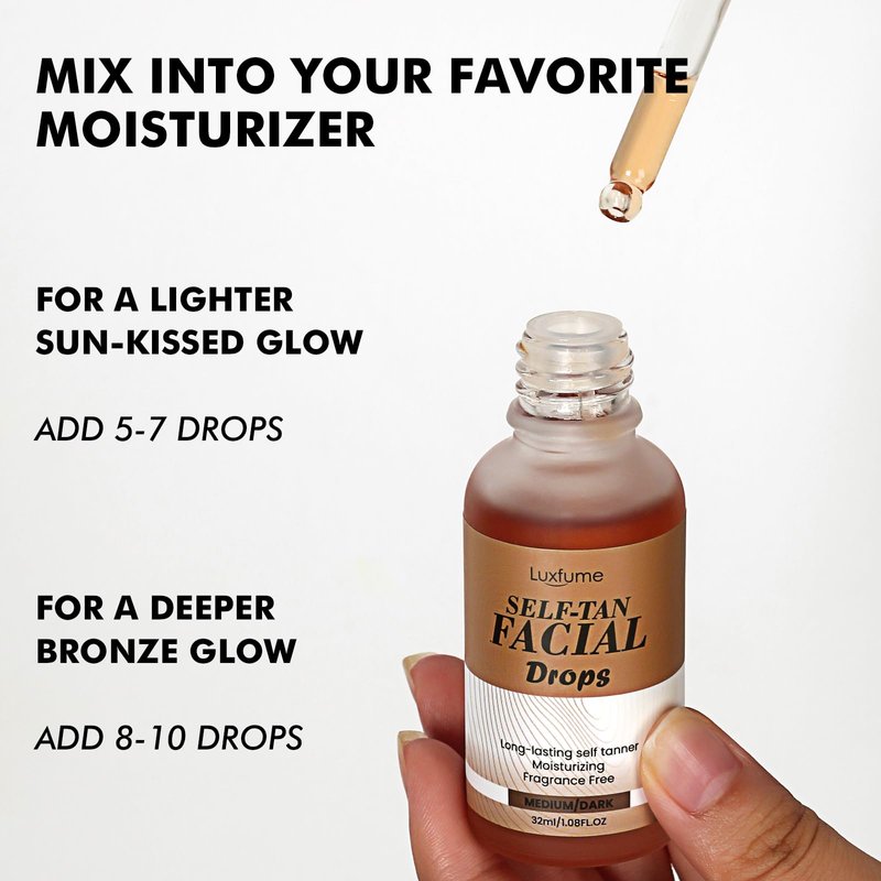 Get your perfect shade with Luxfume's Sunless Tanning Drops,Just add 1-12 drops to your favorite moisturizer, mix and apply. You'll see results within 4-6 hours! Whether you're after a subtle glow or a deeper tan, our drops let you take control. Luxfume Self Tanning Drops are versatile too-try our tanning drops, self-tanning mousse. Whether you're using on your face or body, these products hydrate and even out your skin tone. Choose your shade from Medium and Dark or Light, Medium, and Dark.