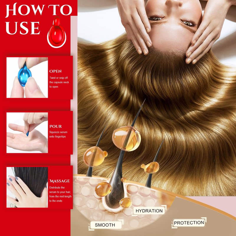 【️ Hair Serum Capsules】-Luxsea Restorative Serum Capsules are formulated with herbs to provide adequate vitamins for damaged hair so that it can protect your hair from damage. The protective conditioner is a tailor-made solution for oily roots, dry and rough hair and hard to manage hair. You can relieve frizz and breakage with just one use, freeing you from tangles and split ends. 【️ Vitamin Hair Growth Capsules】-Luxsea Hair Frizz Relief Treatment Serum is rich in vitamins yet not greasy at all, providing essential nutrients for damaged hair, for dry and damaged hair and growth, giving you shinier, thicker and healthier hair all day long. 【️ Smooth Hair Anti Frizz Serum】- Hair Repair Serum Oil will provide all-around protection for your hair. It will not only add 90% more shine and softness to your hair, but also help lock in hydrating shine without fear of frizz, split ends and other hair troubles. In your daily life, you need Luxsea Hair Massage Oil to help you create smoother and shinier hair. 【️ Portable Hair Repair Conditioner】-Luxsea hair care essence is wrapped in mini capsules, you can repair your hair anywhere. Just rotate the head of the capsule and you will get a clear refreshing essence. Let the essence be distributed in the palm of your hand, then gently apply the treatment oil to your hair without rinsing. This lightweight hair serum gives you instant access to completely transformed hair for frizzy and damaged hair. 【️Created for All Hair】- Luxsea Damaged Hair Repair Treatment is for all hair types including long, short, fine, colored, wavy, curly and straight hair. It will leave your hair with a light fragrance and full of shine.
