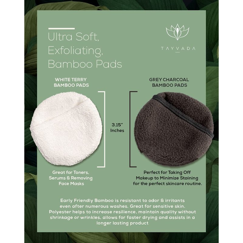 - DON’T LET YOUR EXPENSIVE SKINCARE PRODUCTS GO TO WASTE with non-absorbent, thin cotton pads for face! Unlike others, Tayvada REUSABLE FACE PADS are made with 4 LAYERS OF FABRIC, including HIGHLY ABSORBENT BAMBOO. We include two types of reusable makeup pads in each set: PLUSH, WHITE TERRY BAMBOO PADS that are great FOR TONERS, SERUMS & REMOVING FACE MASKS, & GREY CHARCOAL BAMBOO PADS perfect for TAKING OFF MAKEUP to MINIMIZE STAINING for the perfect skincare routine.