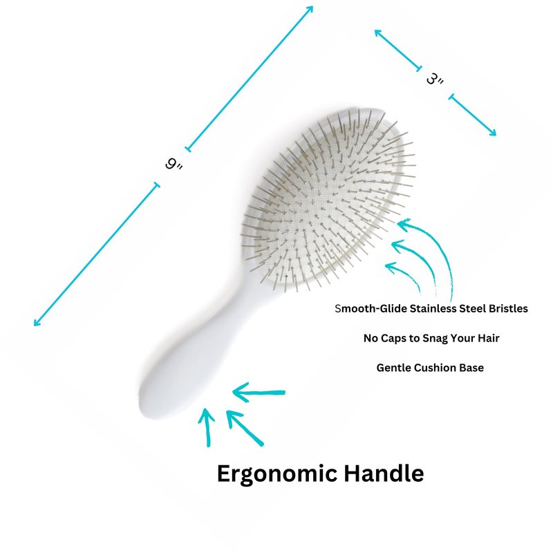 - Boost Hair Health – Did you know scalp massages can improve blood flow and hair growth? Your detangling hair brush has a rubber cushion and gentle pins for a rejuvenating massage with each use.