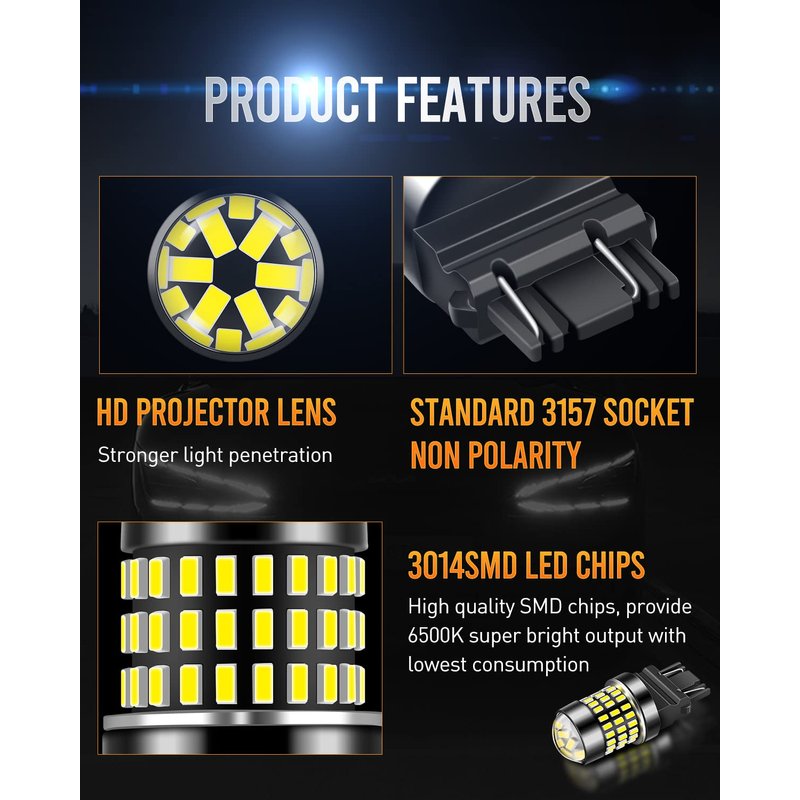 - ✔【Super Bright & Low Power】(Set of 2 bulbs,6500K,xenon white) 3157 3014 78-EX chipsets LED bulbs,total 1800 Lumens,3.6W per bulb,working voltage:Dc 9v-30v.For most vehicles, just Plug & Play replacement LED.