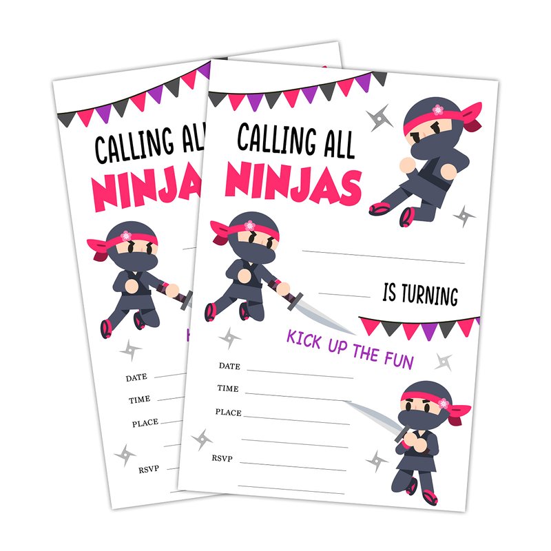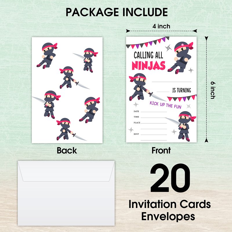 - BIRTHDAY INVITATION CARDS - Ninja Girls Warrior Party party invitations measure 4" x 6" and come with a corresponding envelope to insert the card into. so, you will receive a set of 20 envelopes with 20 invitation cards.