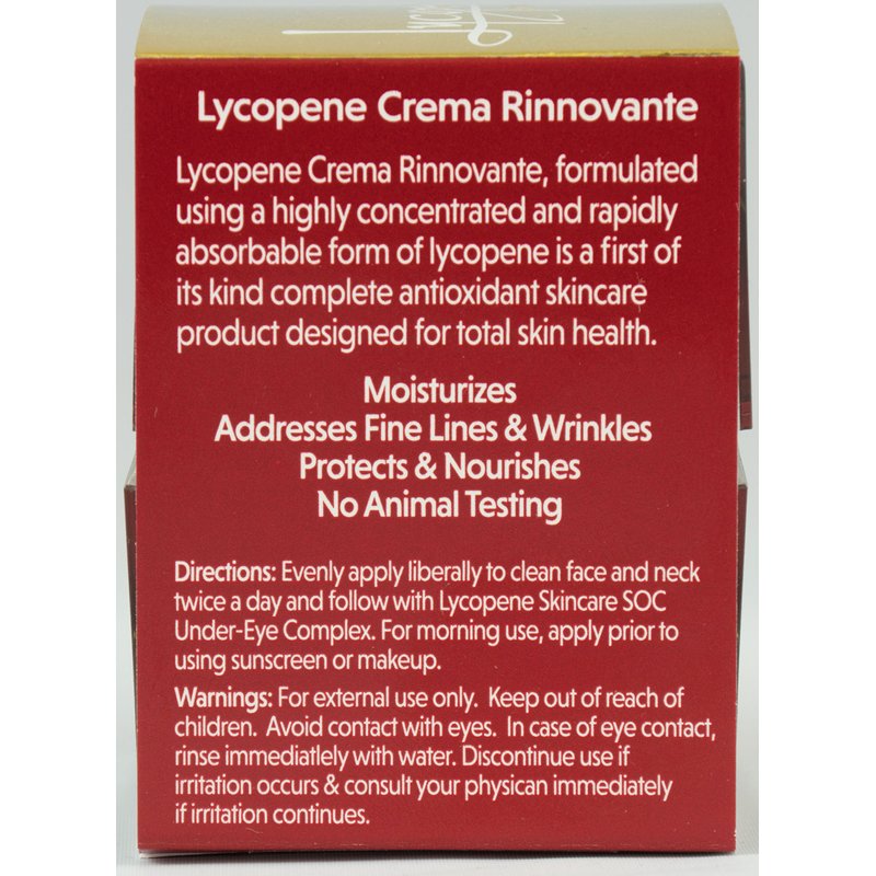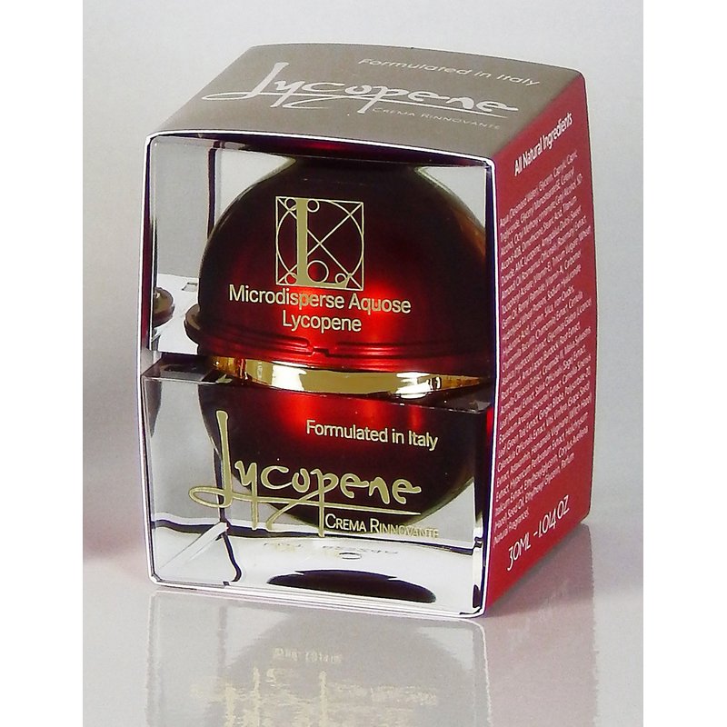 Crema Rinnovante Lycopene is a luxurious, rapidly absorbed, skin protecting, hydrating, and theraceutic cream rich in two of nature’s most potent antioxidants. Lycopene extracted from organic tomatoes and Astaxanthin from marine algae are combined to combat the skin damage that results from the daily exposure to environmental free radicals, pollutants and the sun’s UVA and UVB rays. Along with these antioxidants, this unique cream differs from other anti-aging products by the addition of the next generation of Hyaluronic Acid and nineteen other botanicals essential for skin health and beauty. This advanced form of HA hydrates better than other creams because of its ability to be more efficiently absorbed and longer lasting than other hyaluronic acid products. Acmella oleracea flower extract, unique to Crema Rinnovante Lycopene, is a natural muscle relaxer shown to visibly reduce fine lines and wrinkles. This “Green” product, formulated in Italy, is paraben free and uses natural preservatives. Crema Rinnovante Lycopene is never tested on animals.