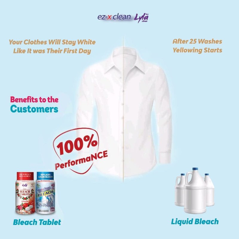 - ECONOMIC CLEANING SOLUTION: 1 bottle of Lyla Clean bleach tablets is equal 6 liter of concentrated liquid bleach, It's lightweight and small, saves space, easy storage and easy measurement, Removes dirt and stains, provides maximum whiteness